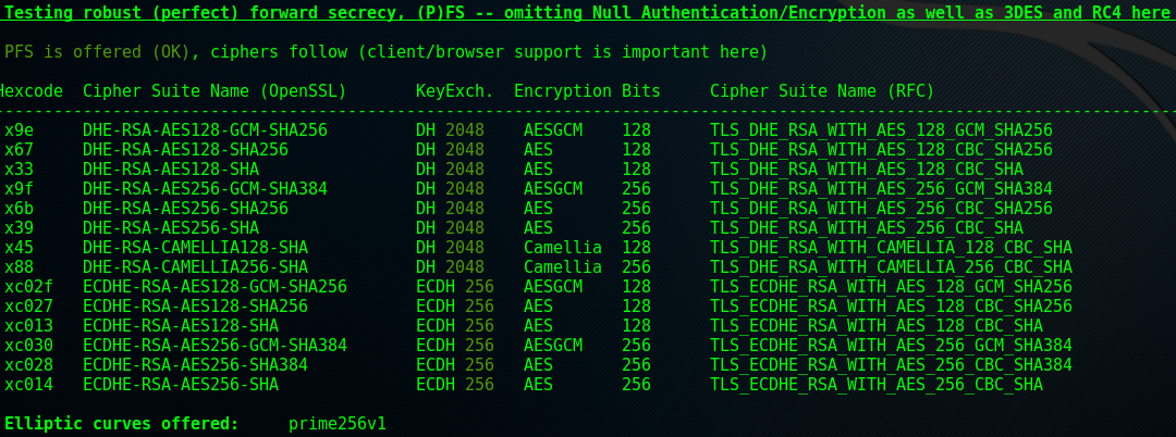 This section tests support for various cipher suites that testssl groups into categories. We only want to support ‘high grade encryption’ which currently is considered to be 128 bit ciphers as a minimumhowever, NIST guidelines (p. 51) state that 112 bits of cryptographic strength is sufficient. Further discussion regarding this can be found in the ‘Battle of the bits’ section nearer the end of this post. Please note that a cipher, e.g. ECDHE-RSA-AES256-GCM-SHA384, is not to be confused with a protocol, e.g. SSLv3 or TLS 1.2. A brief description of the main components of a cipher suite, for example the one previously mentioned, can be found below.